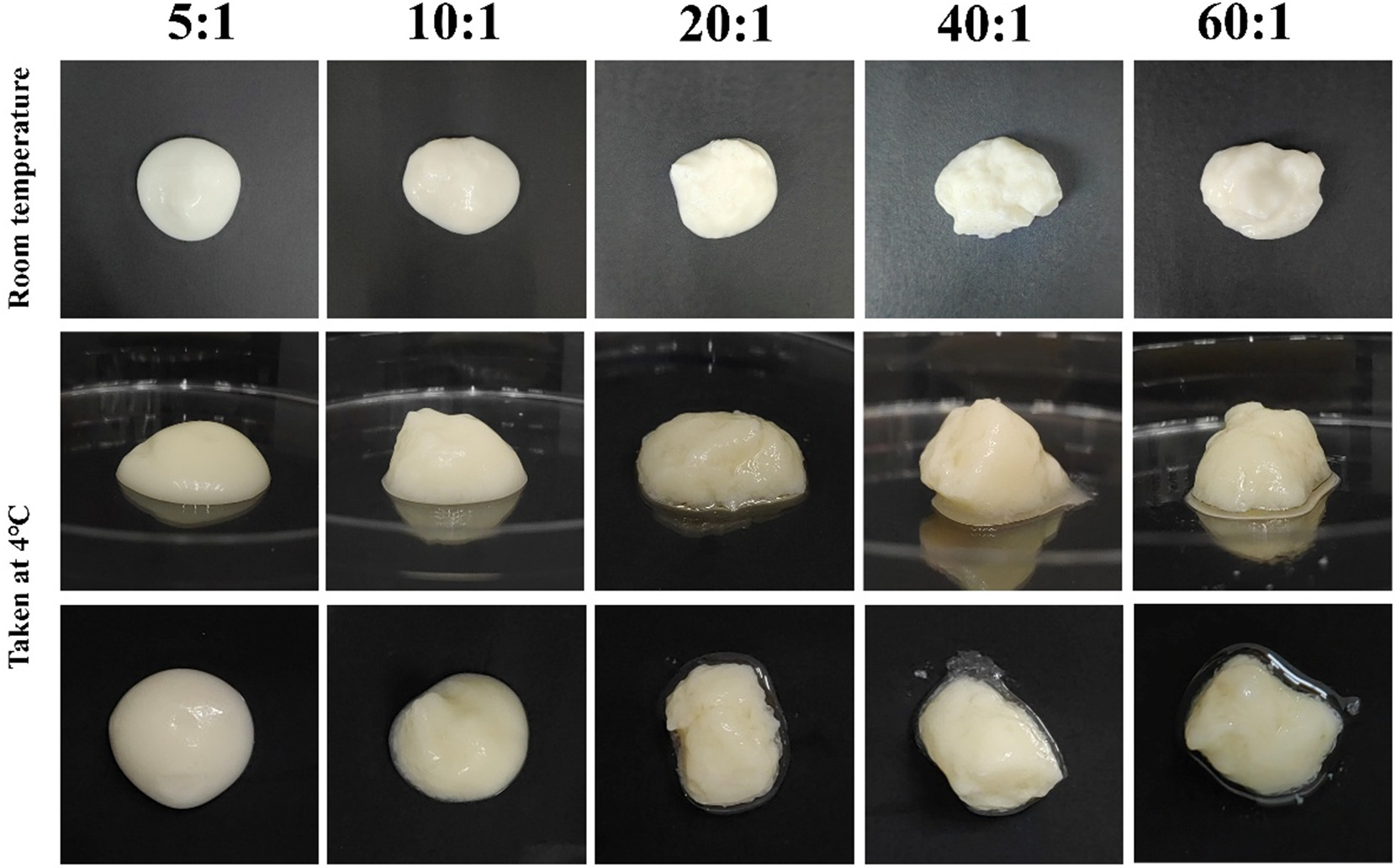 圖 1 不同 SPI-HMP 配比復合乳化凝膠的宏觀形貌。所有樣品分別于室溫條件下、以及 4℃冷藏環(huán)境取出后立即進行拍攝。